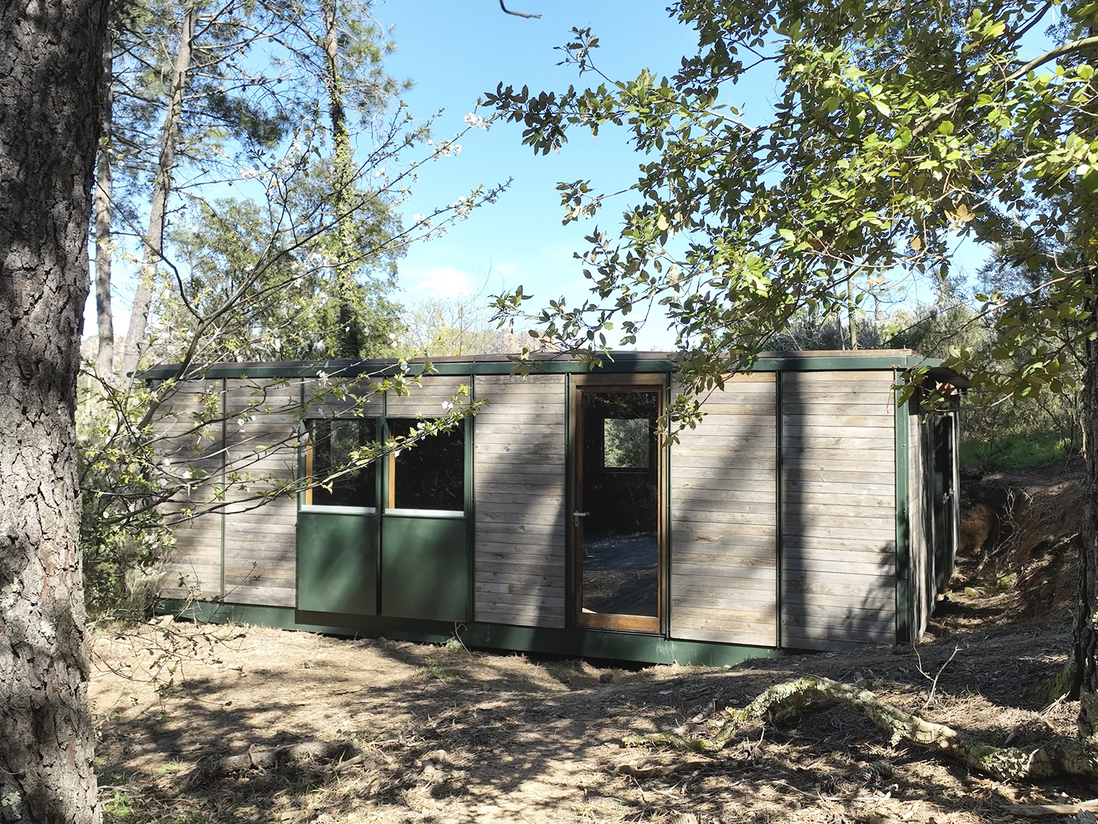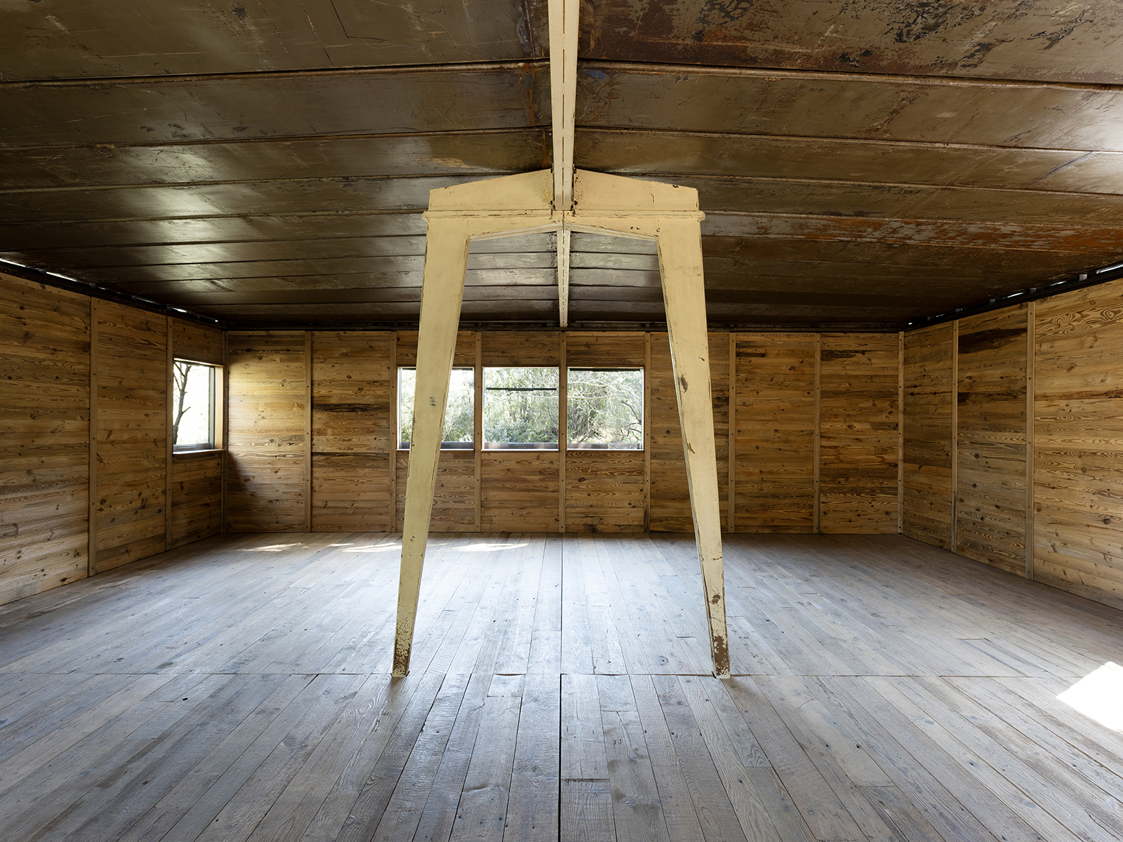 Based on Prouvé’s axial portal frame construction principle, patented in 1939, it is composed of lightweight prefabricated components in metal and wood. Steel, which had been limited to strict quotas during the War, is reserved for the folded metal frame, with standardized wood panels inserted into it. Unlike the models produced during the War, some of the facade panels and windows are fitted with sheet-steel covers, improving their durability.