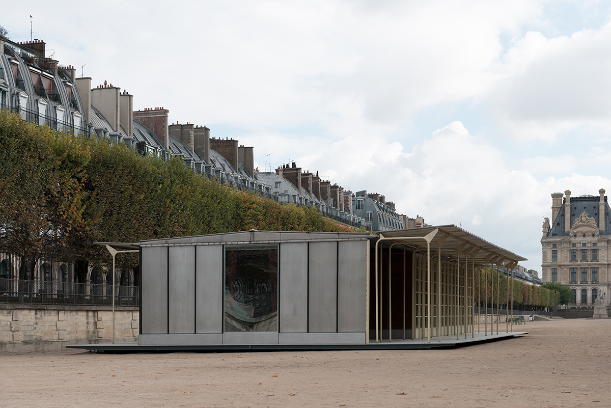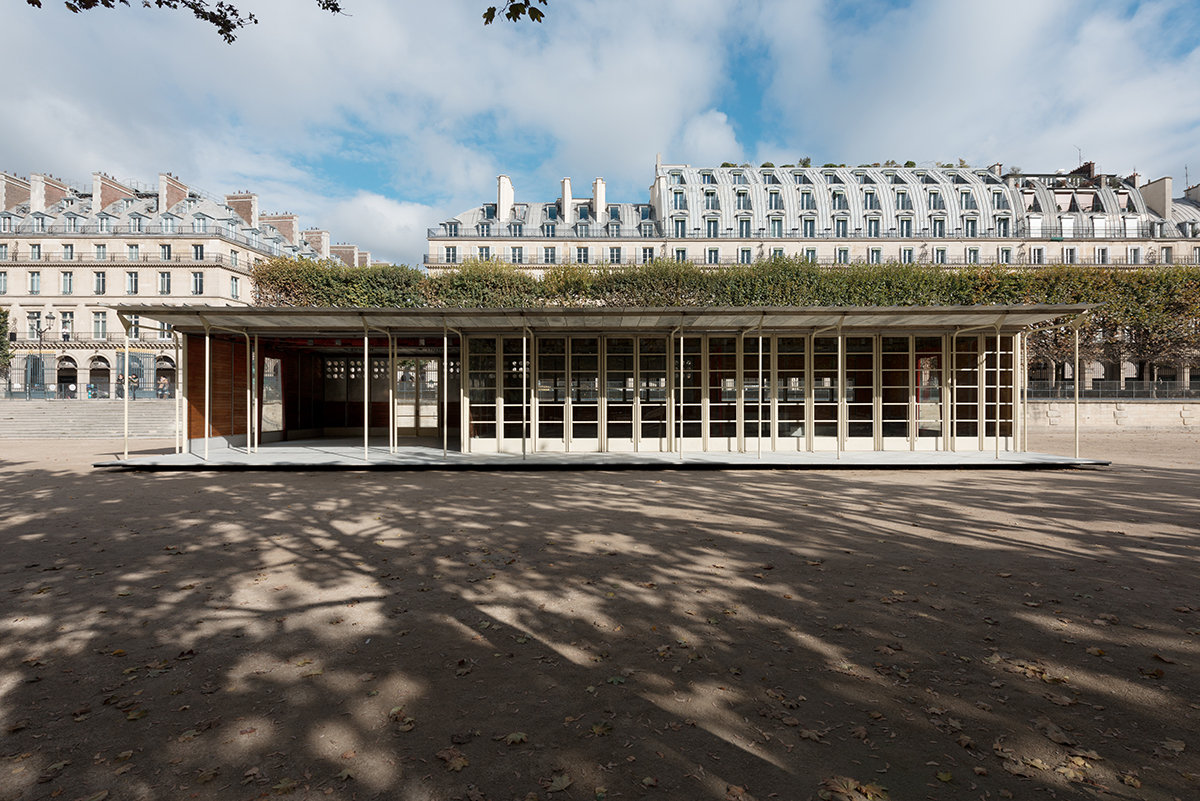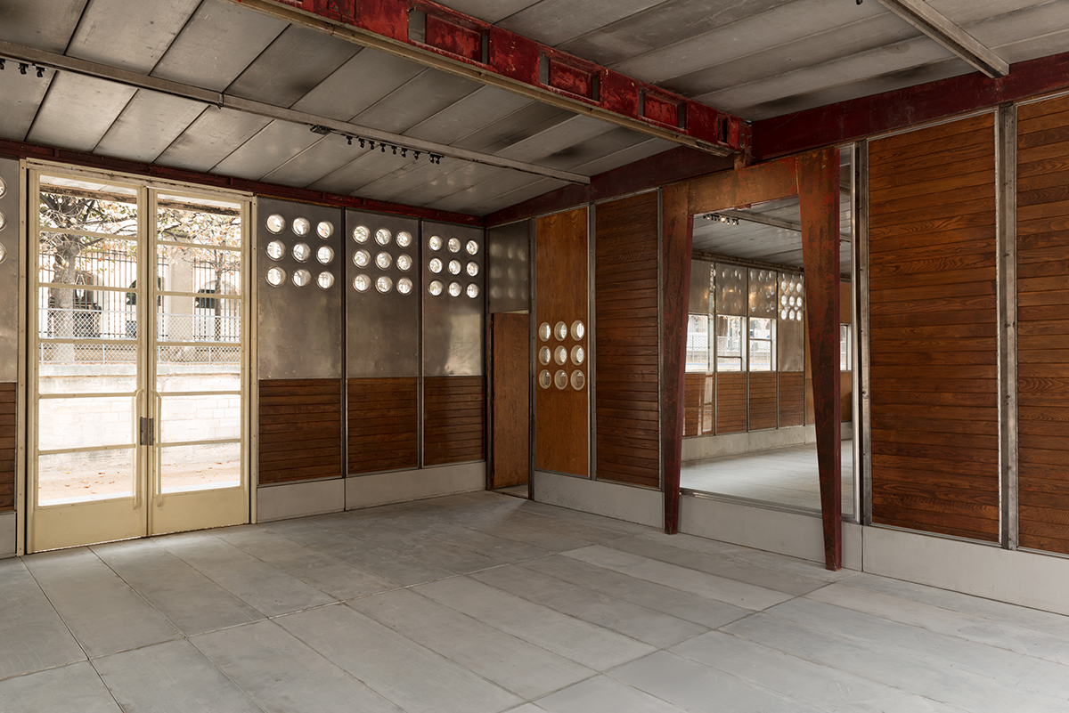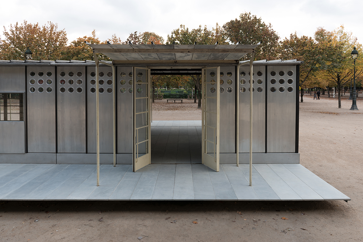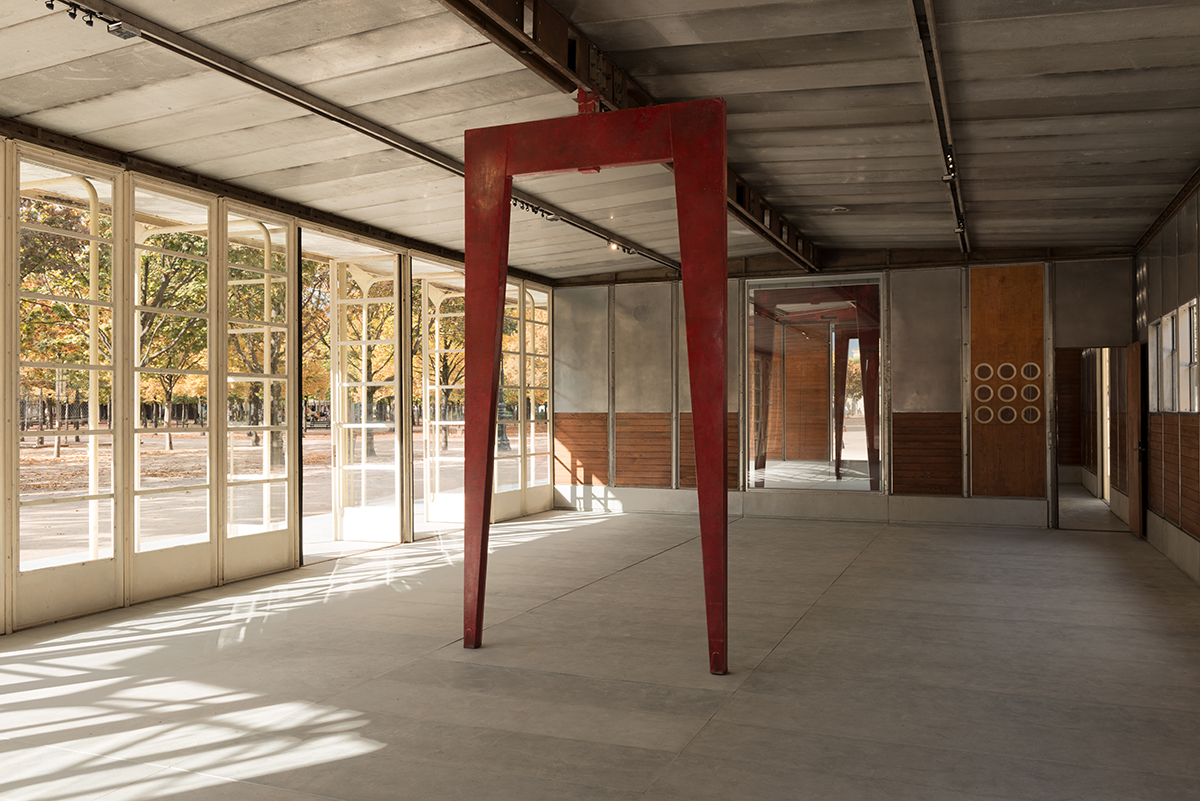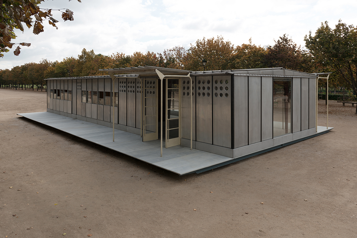 On the occasion of the FIAC, Galerie Patrick Seguin is pleased to present the Jean Prouvé Bouqueval School in the Louvre and Tuileries National Estate from October 18th to 27th. After making temporary and demountable houses for war victims in Lorraine at the end of World War II, the Ateliers Jean Prouvé committed to the French government’s reconstruction program, involving not only housing, but also infrastructure, notably schools. Prouvé saw prefabrication as the optimal technical and economic solution to the postwar situation. He perfected a system he had patented in 1939 and then improved during the War, featuring a metal skeleton using axial portal frames, combined with various modular facade panels. This construction principle was Prouvé’s response to the Ministry of Education’s 1949 competition for “a mass-producible one-room rural school with teacher accommodations.” The specifications called for buildings that could be easily mass-produced with quick and easy assembly on any kind of site. The Ateliers Jean Prouvé was among the winners of the competition and in May 1950 was given an order for two prototype units: one for the small municipality of Bouqueval, near Paris, and the other requested by parliamentarian Raymond Mondon for the village of Vantoux, near Metz. Galerie Patrick Seguin asked Ateliers Jean Nouvel / HW Architecture to consult on the development and setting up of the Bouqueval School. This adaptation, designed in harmony with the existing materials, allows for full appreciation of Jean Prouvé’s structural system.