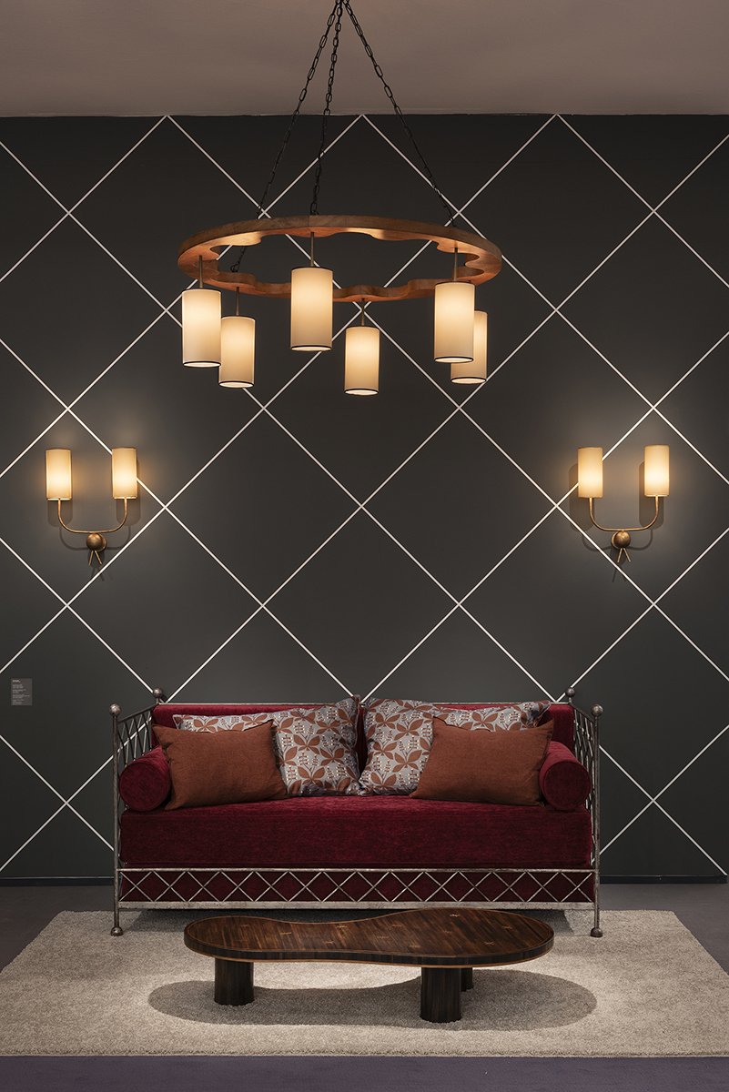 Part of the installation will consist of pieces by Jean Royère, including an exceptional Flaque table in wood and straw marquetry, and a rare Croisillon divan.