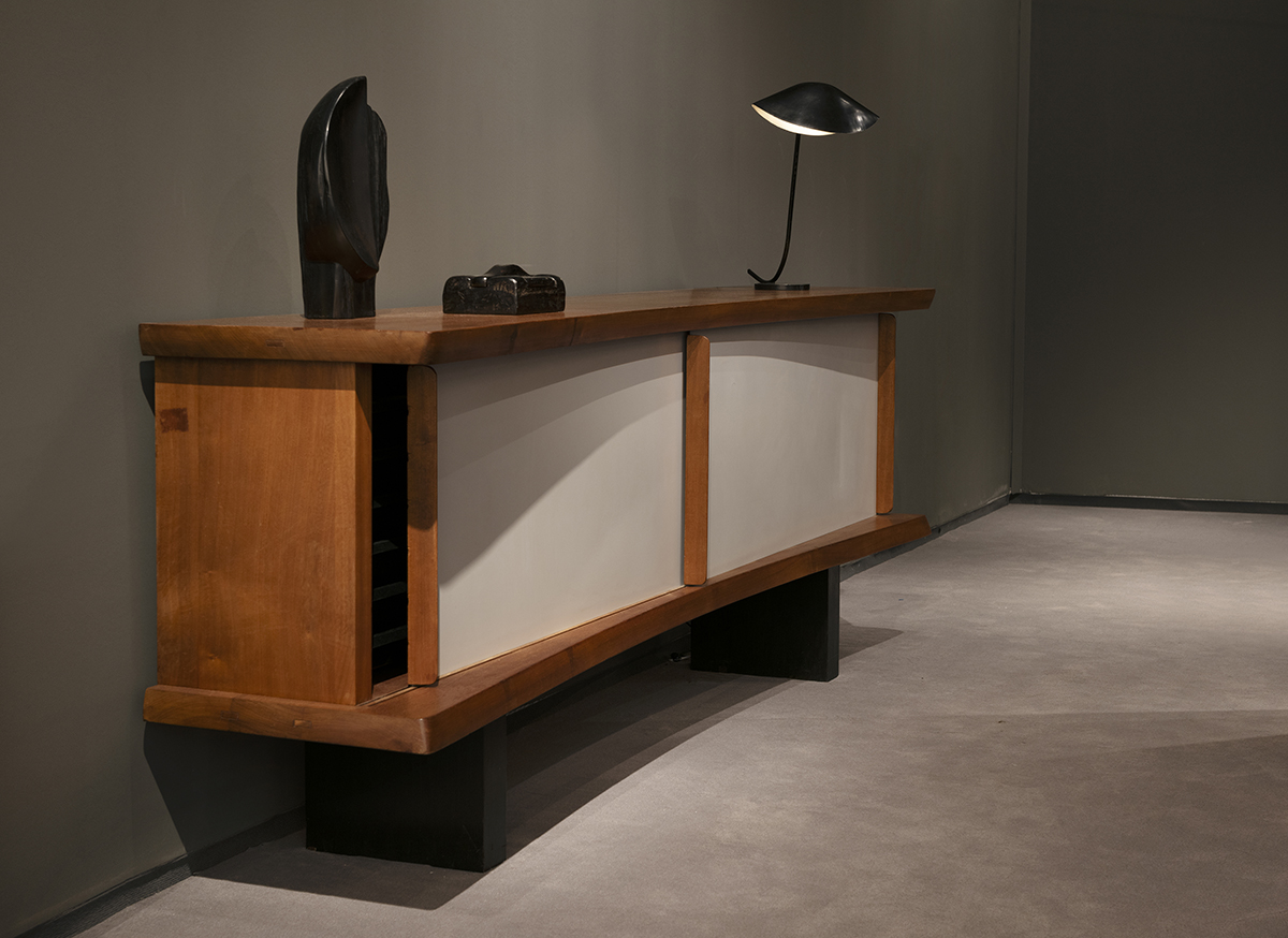 A beautiful curving sideboard, designed by Charlotte Perriand in 1958, forms the link between the spaces displaying pieces by Jean Royère and those of Jean Prouvé. At once elegant and solid, this piece demonstrates the research conducted by Charlotte Perriand into the technical properties of wood through her “free-form” furniture.
