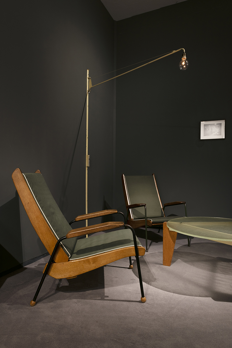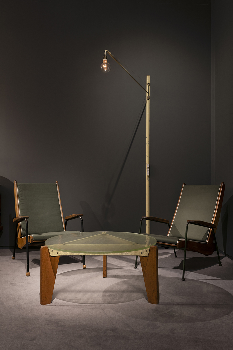 In a demonstration of Jean Prouvé’s creative diversity, another display will unite Visiteur armchairs with a Guéridon Bas, wall-mounted bookcase, daybed and swing-jib lamp. Designed in around 1947 in the context of post-War France, the Visiteur FV 11 armchairs are noticeable for their steel tubular structure, broad backrest and oak armrests. Providing a very large seat for optimum comfort, these armchairs are accompanied by a Guéridon Bas designed by Prouvé in around 1959. Fully demountable, this low table is composed of solid oak legs topped with a slab of cathedral glass. Rare in its height and circumference, this coffee table belonged to Nancy photographer Albert Lott (1910–1991), a friend of Jean Prouvé’s.