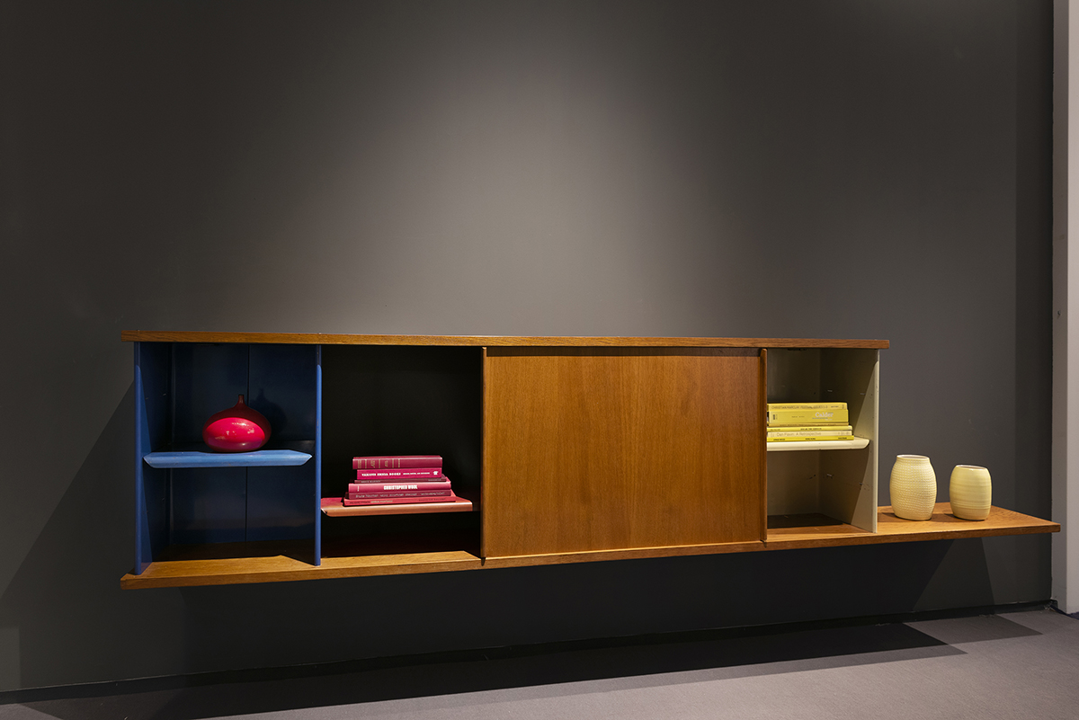 The Antony bookcase combines the concept of a standard sideboard with that of Charlotte Perriand’s shelves, thereby creating a wall-mounted “cabinet–bookcase”, lightweight and functional. The folded sheet metal is painted in bright colours, selected from the range at Ateliers Jean Prouvé. An example of this bookcase is also held in the permanent collections of the Musée des Arts Décoratifs in Paris.