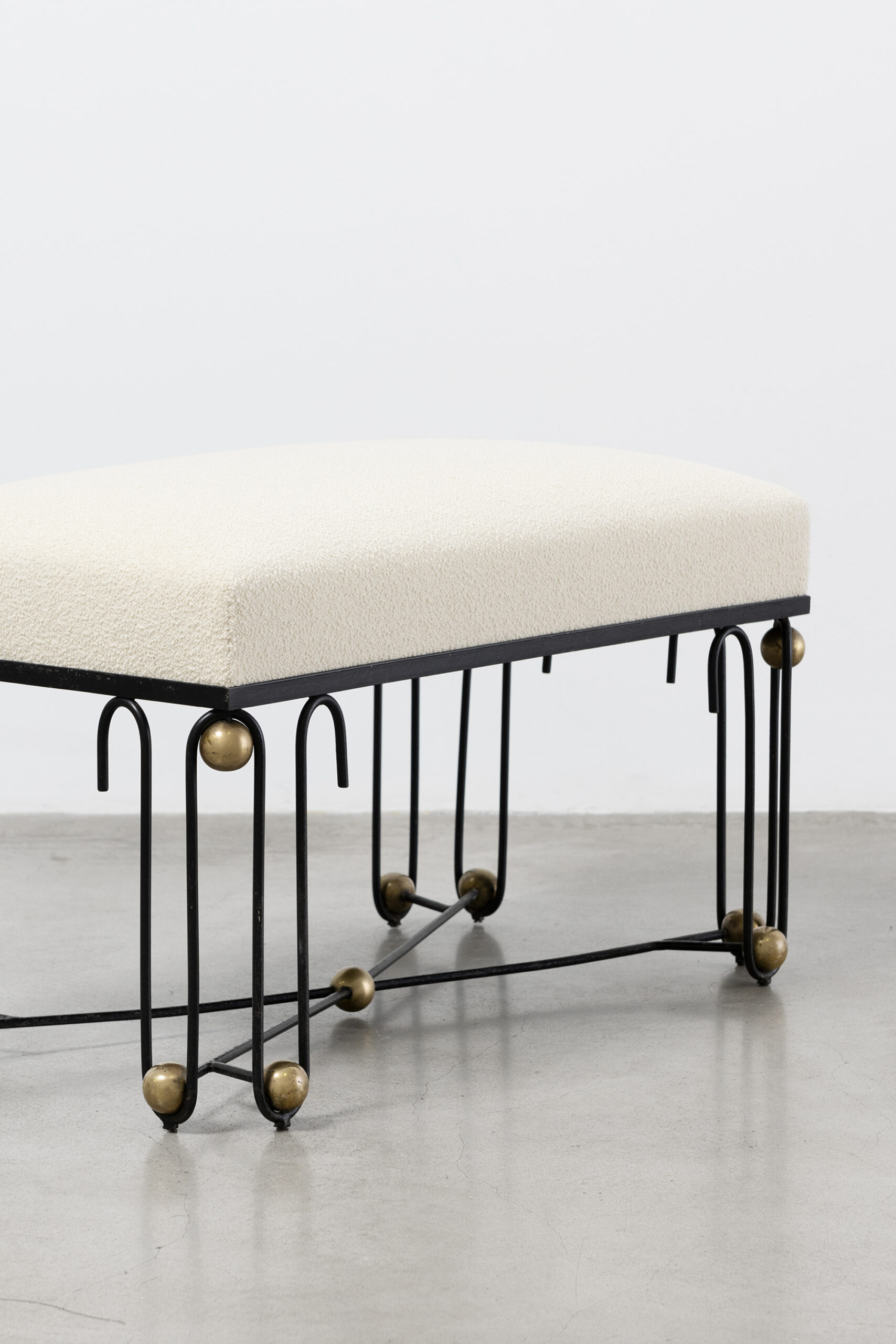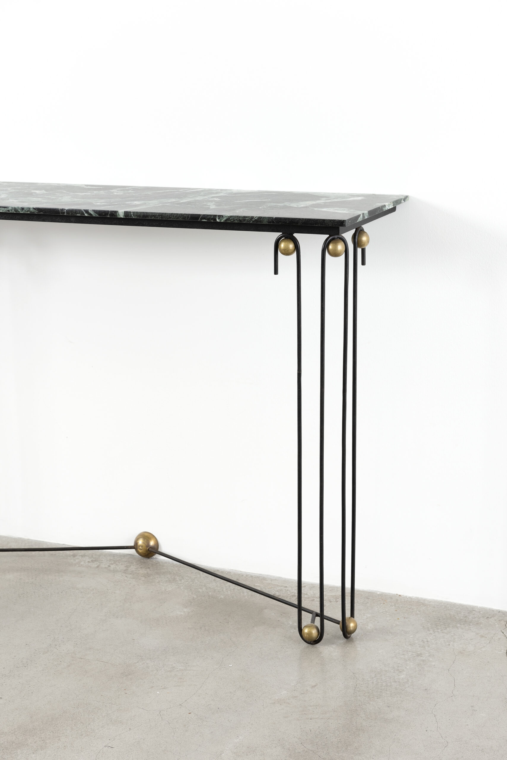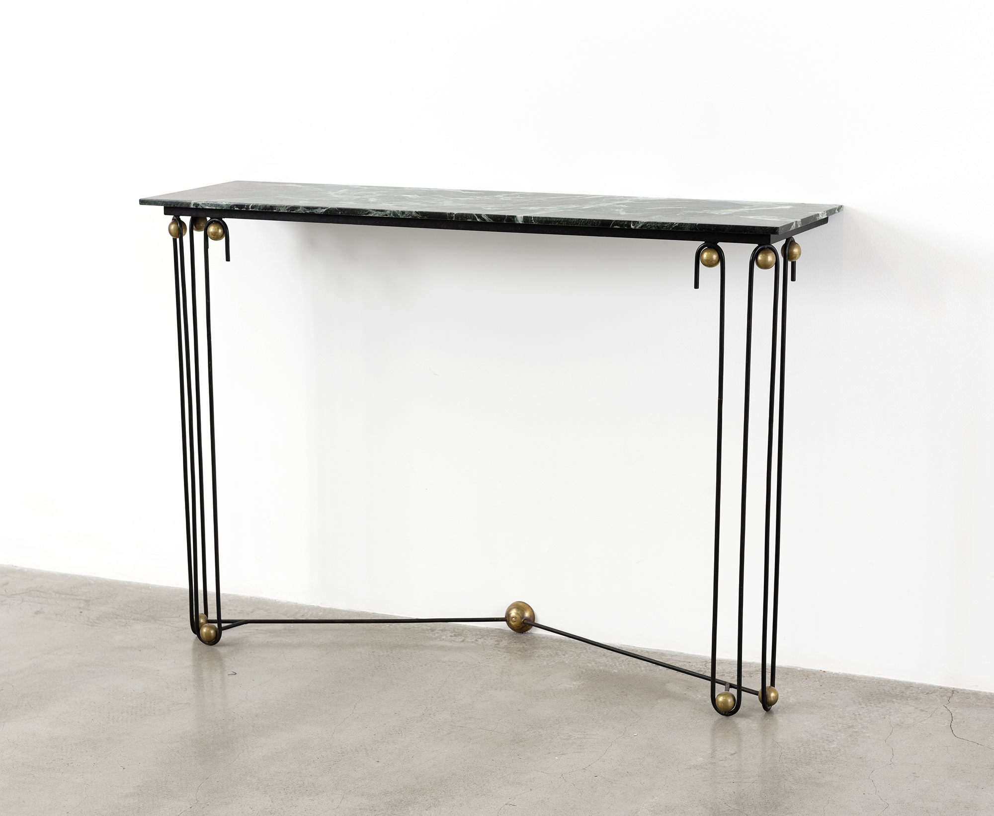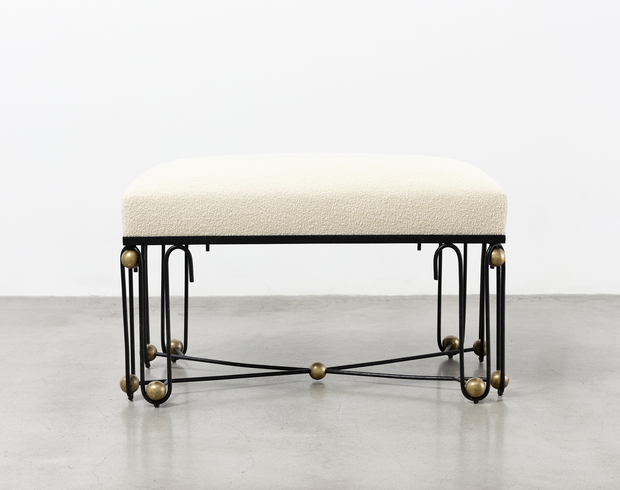 Finally, the “Ondulation” coffee table and the “Petites Boules” console table and pair of stools complete the display. Their wavy, wrought-iron bases give a fluidity to the ensemble.