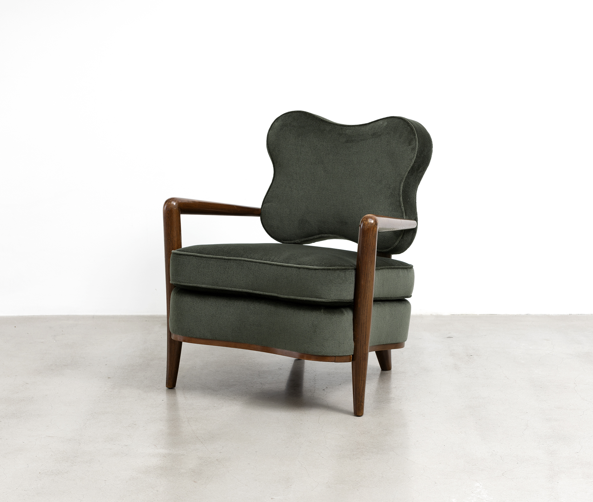 This combination of curves and structure is also seen in the “Trèfle” armchairs, characterized by their backrest in the form of stylized clover leaves. Enveloping and graphic, these armchairs illustrate Royère’s taste for an esthetic that is fluid and full of movement.