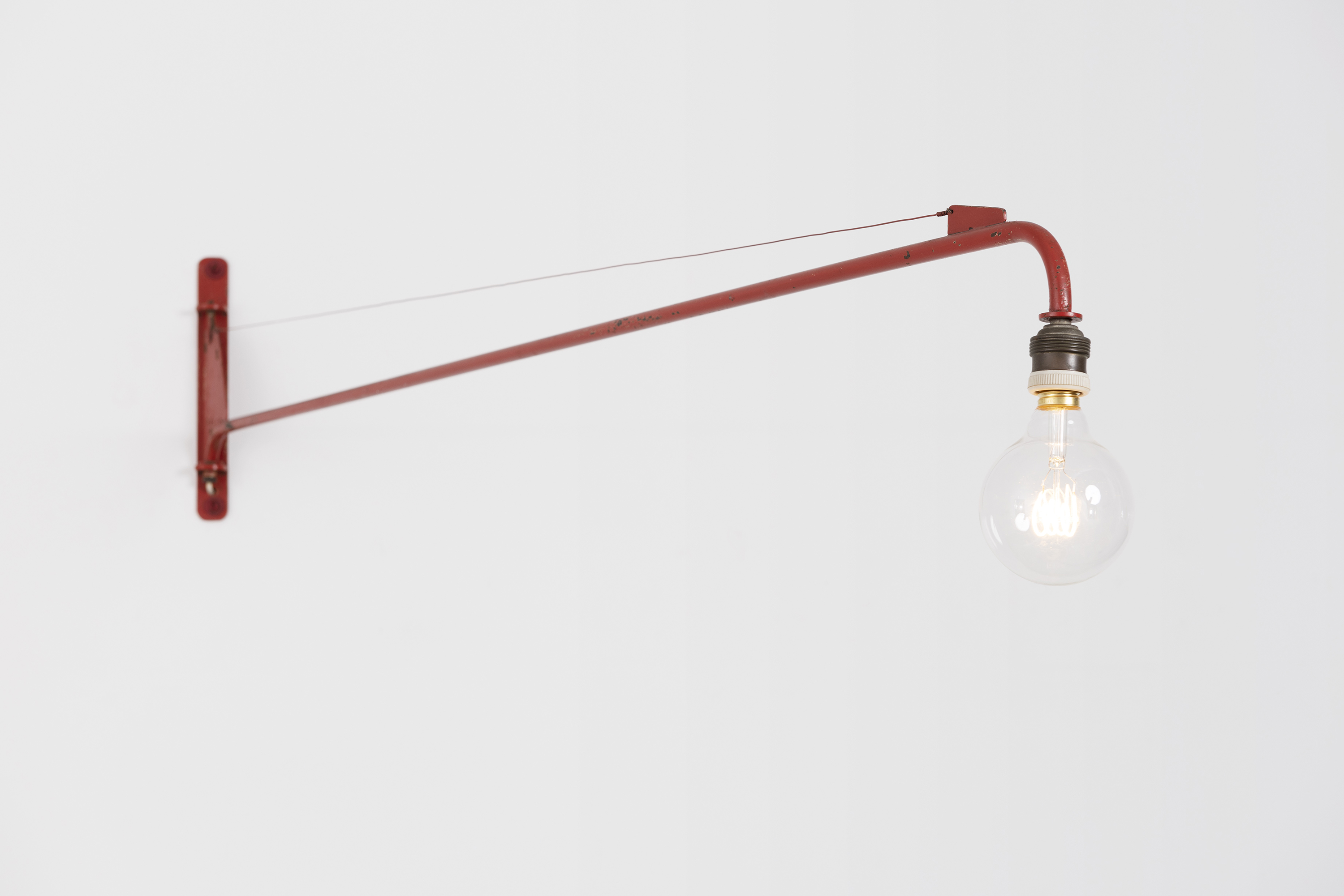 Initially made by JEAN PROUVÉ for his personal use, the tubing “lamp arm” held in place by a steel wire, attached to the wall, and pivoting on its axis was an improvement on the principle developed with Pierre Jeanneret and Charlotte Perriand for the equipping of the temporary SCAL pavilions at Issoire.