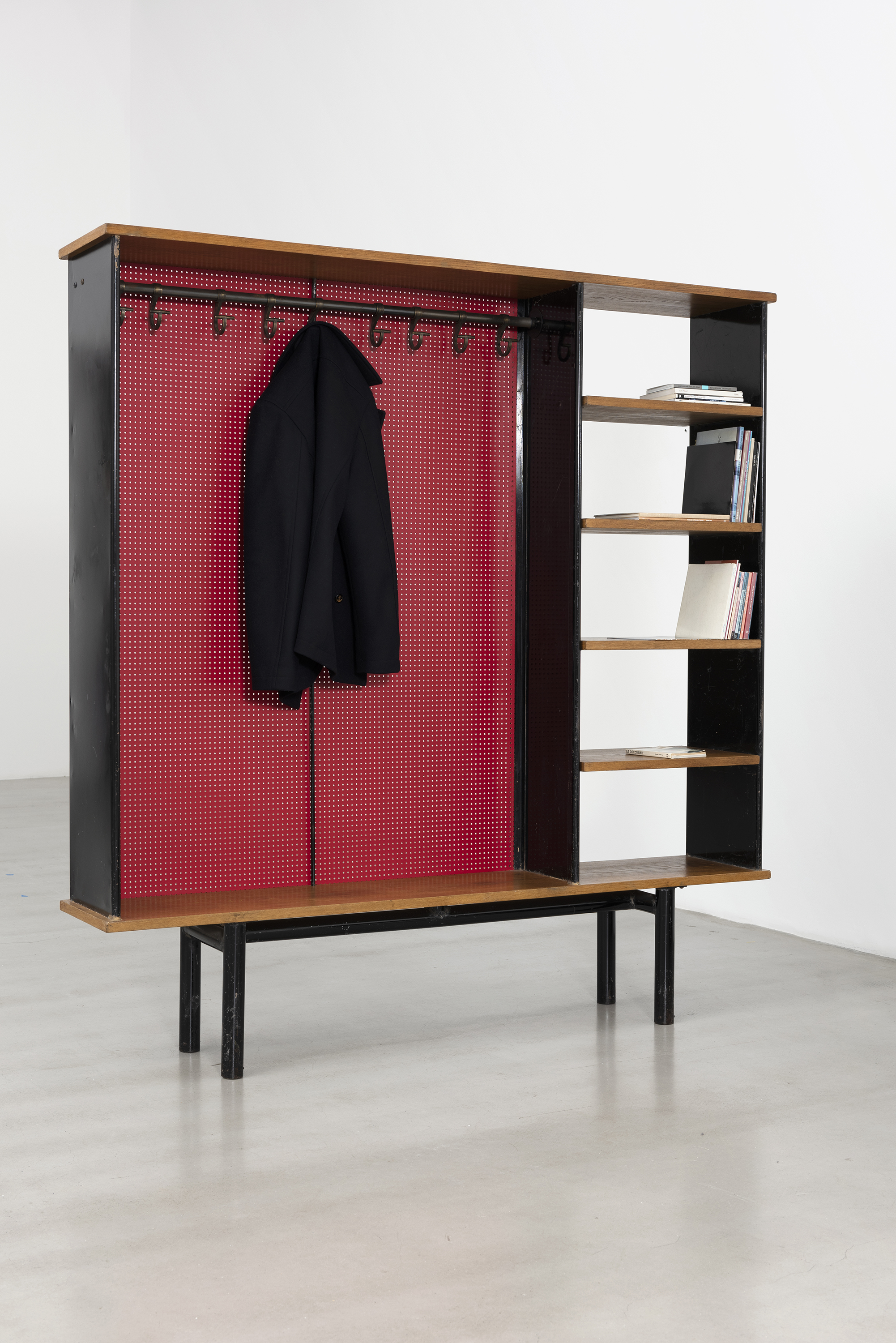 The design of the coatrack that equipped the refectory of the Cité universitaire took into account student’s daily habits and needs within their living space but also the proportions of the rooms. Made of red perforated panels in Isorel assembled with tapped braces to the upper element and its base, the coatrack is an adaptation from the storage units made by Charlotte Perriand for the Hôtel de France in Conakry (Guinea), standing on feet and with no doors. Its distinctive red Isorel panels were also used by Perriand in the making of the wardrobes she designed for the dormitories of the Bellevue secondary school in Meudon in 1952.