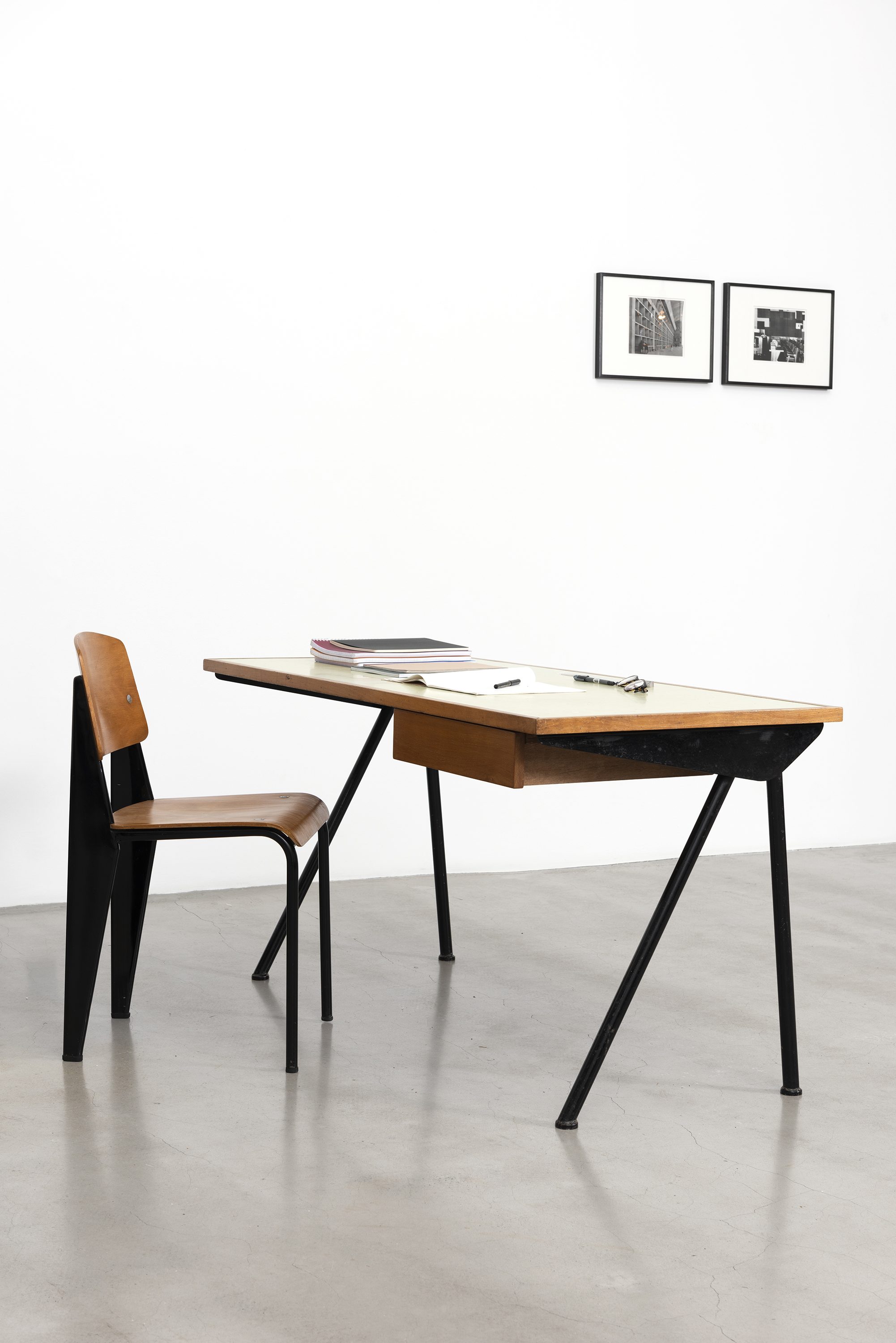This variant with tube legs from 1955 with a top in laminated wood is conveniently equipped with a drawer. Since he had to adapt to cost constraints, Jean Prouvé decided to resort to the tube —that was available in prefab— rather than to manufacture triangular-section legs.