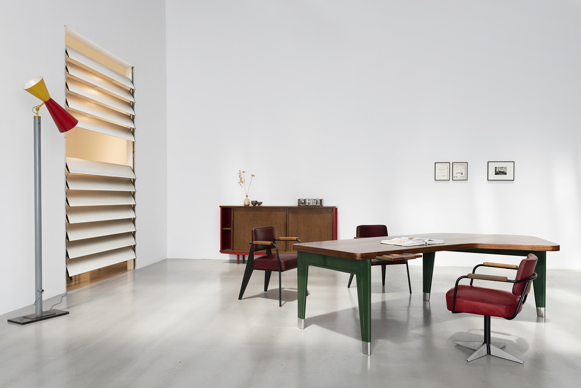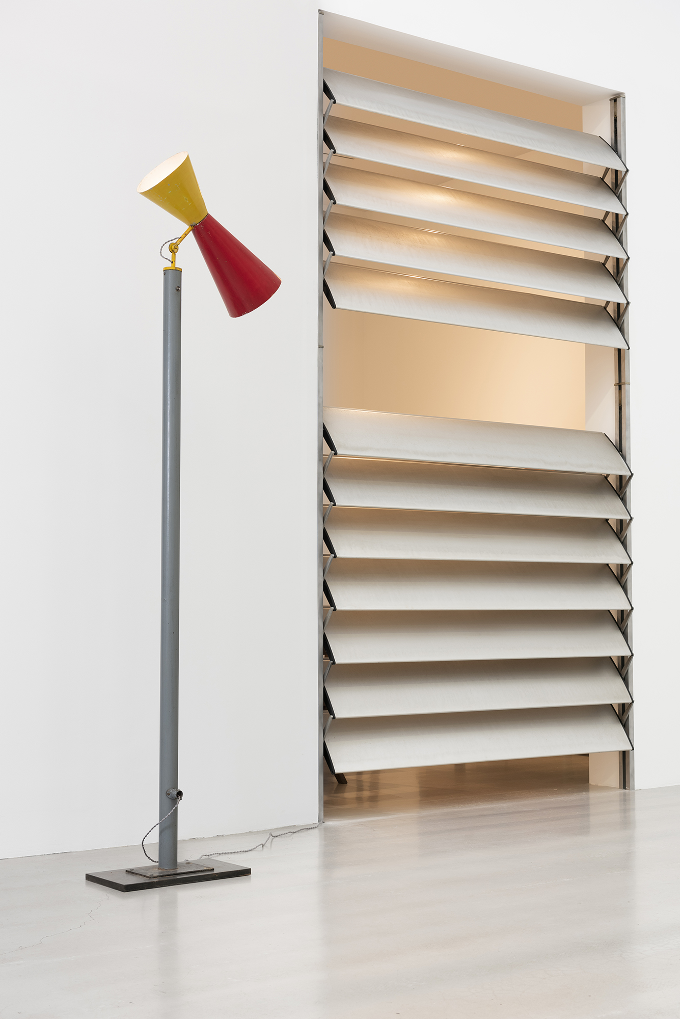 The sun-shutters demonstrate the relevance of Prouvé’s approach to mass-produced climate adaptable architecture. This piece perfectly adapts to a contemporary interior as featured in our set-up, creating an incredible interplay between light and shadow that challenges our senses.