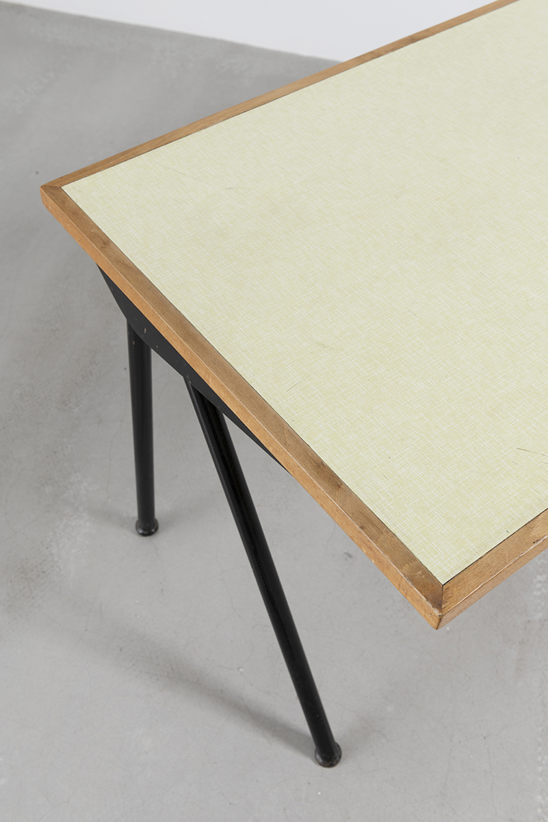 Bureau à piètement Compas, variante avec pieds tube, 1955Tôle d'acier pliée, tube d'acier et bois stratifié