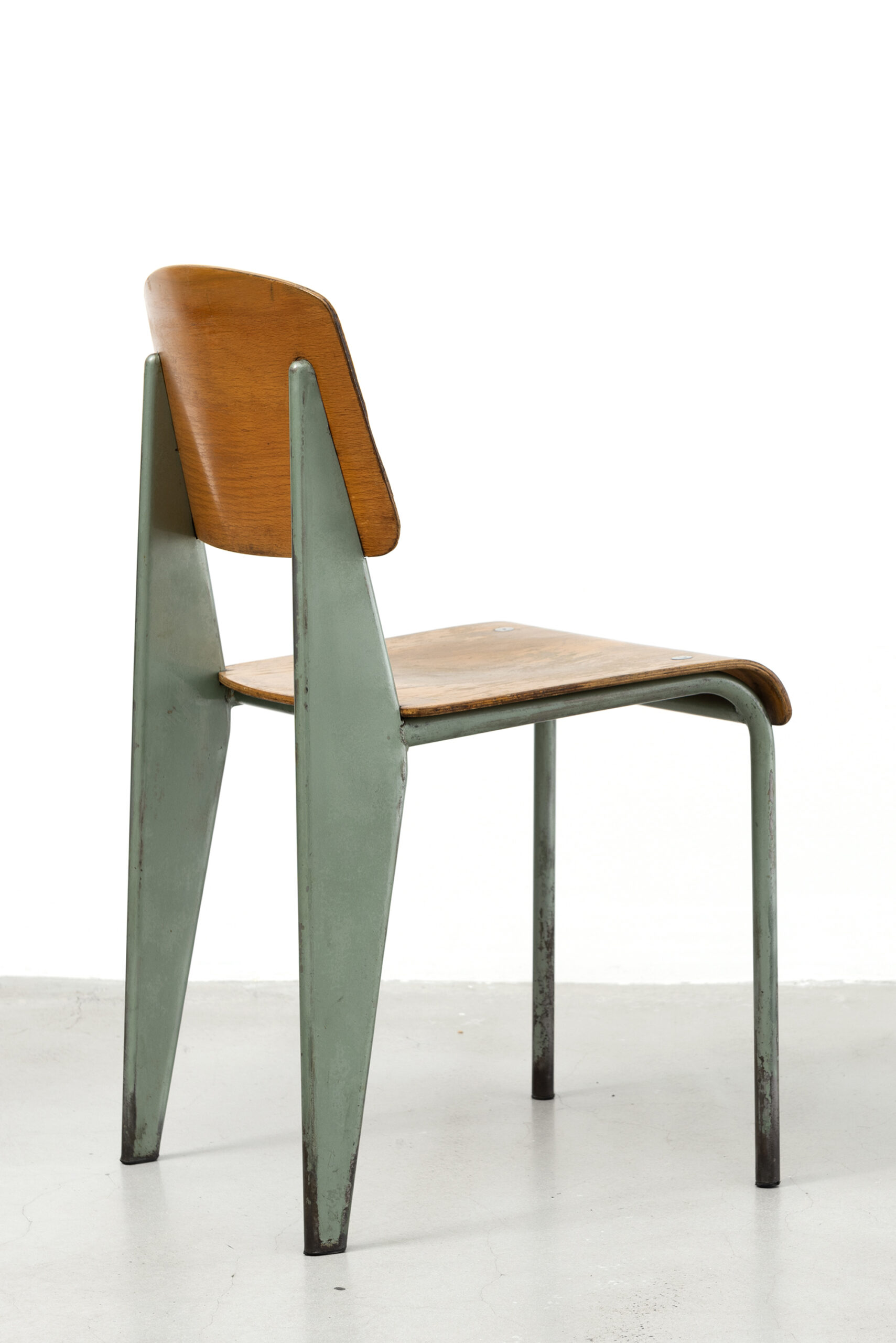 Cette exceptionnelle chaise Métropole no. 305, laquée dans un vert métallique, a été conçue par JEAN PROUVÉ vers 1950. Arborant une couleur rare et élégante, entièrement d’origine, cette chaise révèle une patine remarquable qui sublime ce modèle iconique et intemporel.