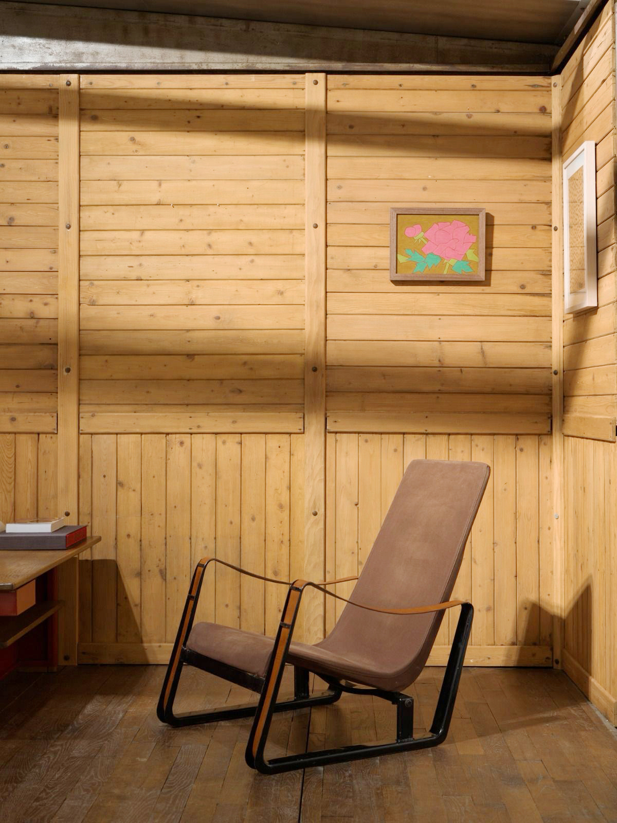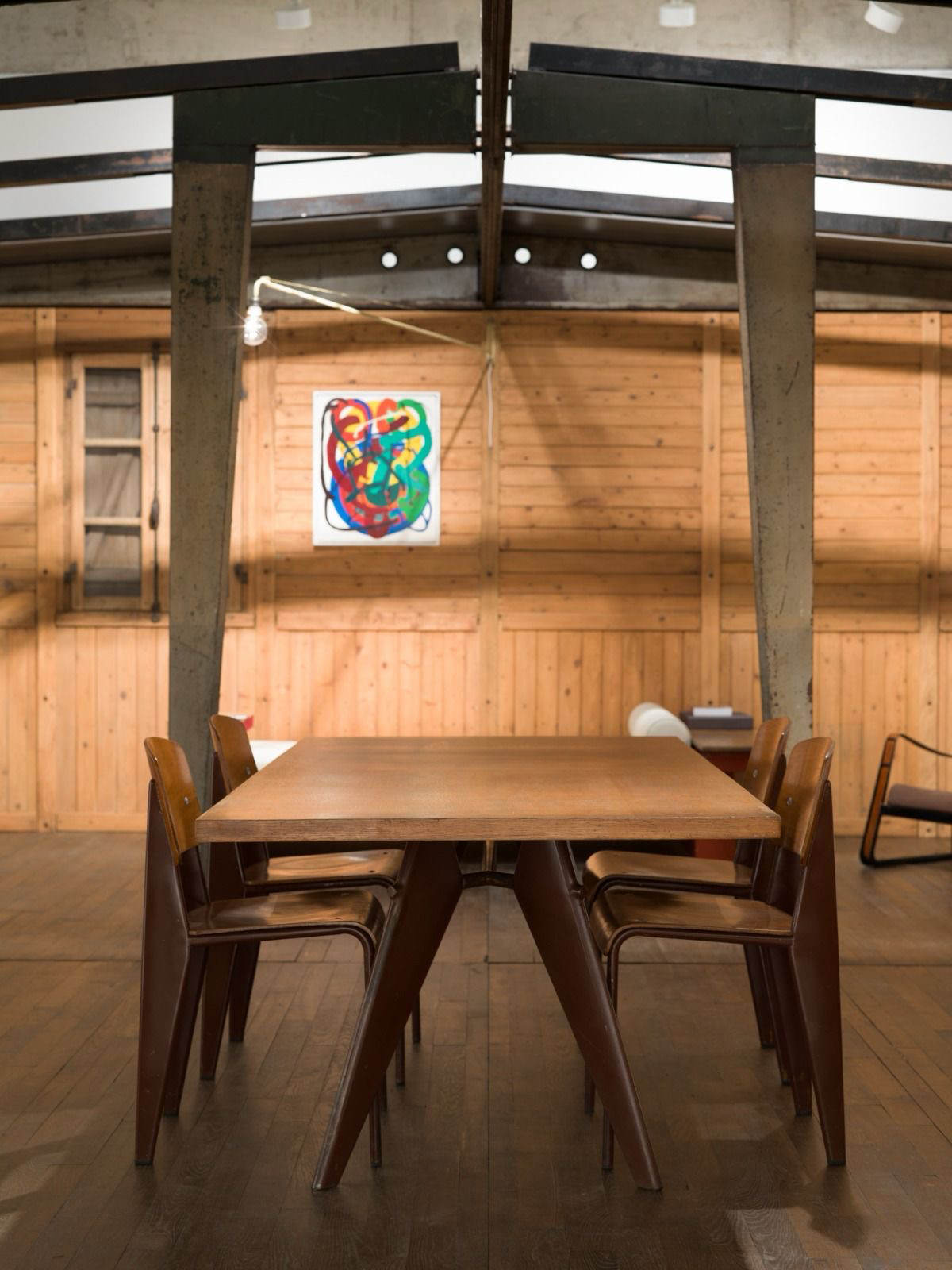 L’exposition inclut également des éléments d’architecture rares de Jean Prouvé, notamment un panneau à hublots provenant de l’École démontable de Bouqueval (région parisienne) et un ensemble de mobilier, également conçu par Jean Prouvé. Parmi les pièces phares figurent la table en aluminium n° 804, un prototype rare exposé pour la première fois, un ensemble issu d’une seule et même provenance comprenant une table S.A.M. n° 506 et ses quatre chaises Métropole n° 305, toutes laquées en brun Van Dyck, ainsi qu’un fauteuil Cité datant de 1930.