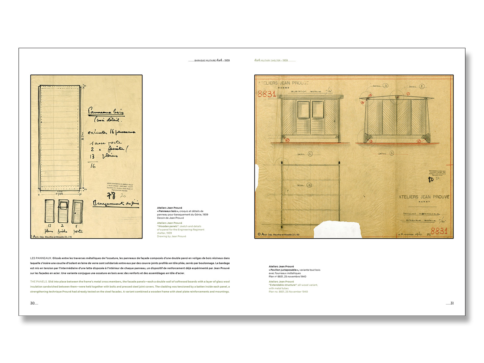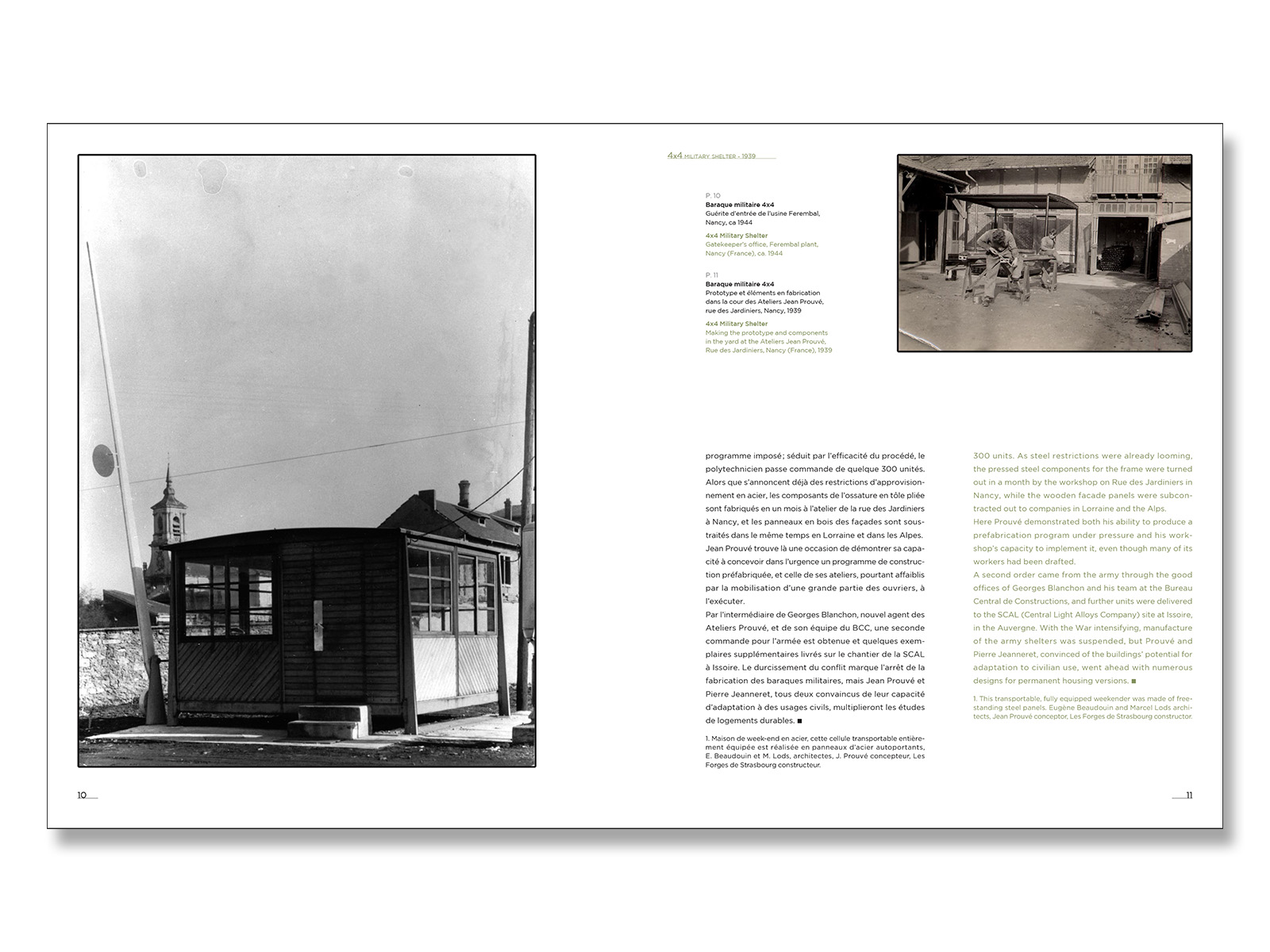 En 1939, le général Dumontier, chef de la 5ème armée, commande à Jean Prouvé la réalisation de 300 petits pavillons destinés à abriter de 4 à 12 hommes. Adaptant le système de structure porteuse extérieure mis au point pour un programme de loisirs, les Ateliers Jean Prouvé produisent quelques centaines de cellules juxtaposables de 4×4 mètres, dont l’ossature extérieure en tôle pliée peut être rapidement montée et démontée par seulement deux hommes. Dans les conditions extrêmes de la guerre, Jean Prouvé démontre ainsi sa capacité à concevoir un programme de construction préfabriquée et ses ateliers – pourtant affaiblis par la mobilisation d’une grande partie de ses ouvriers – à l’exécuter dans l’urgence.