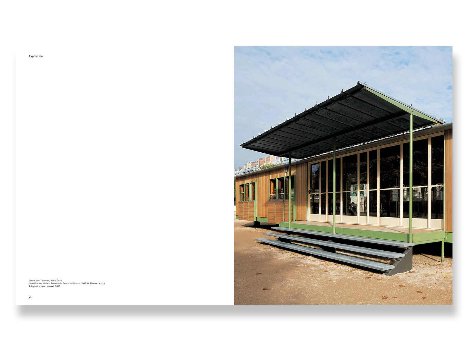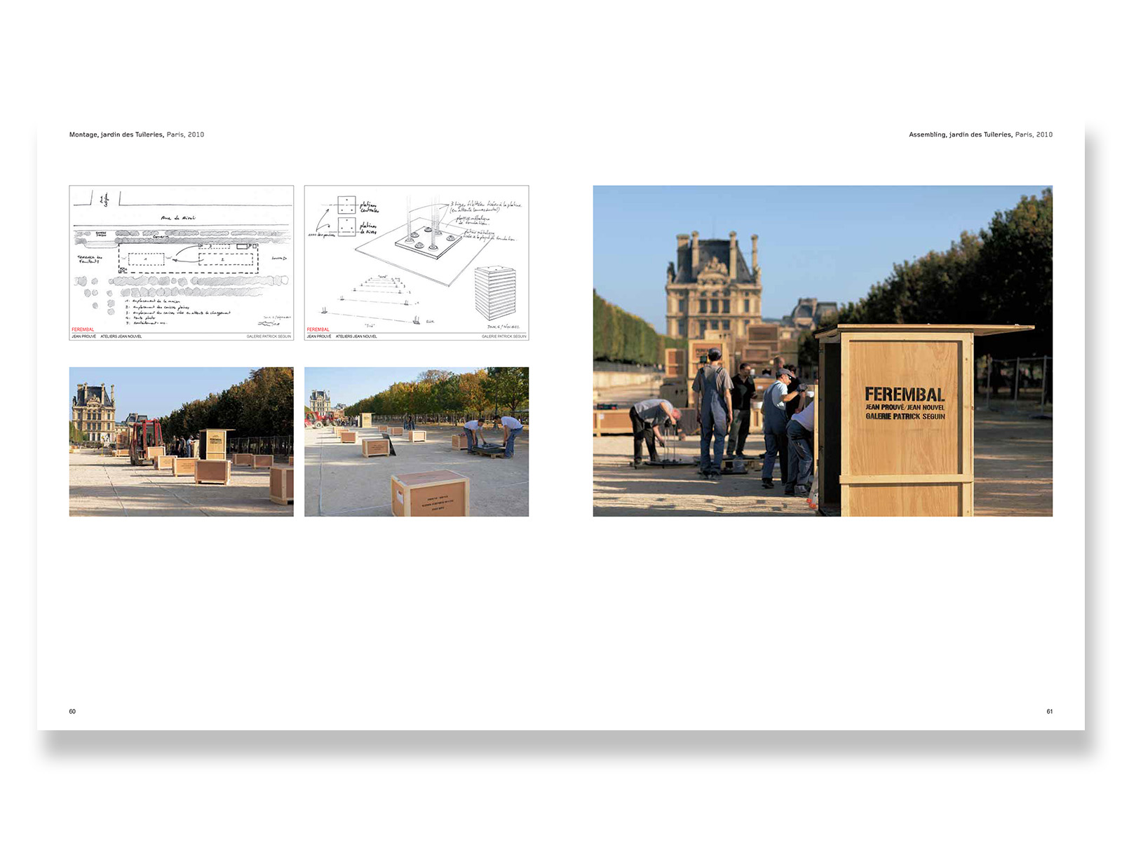 Cette construction originellement en étage et posée sur un socle maçonné, a été adaptée à unenouvelle configuration de pavillon de plain-pied. Utilisant les moyens techniques actuels, Jean Nouvel révèle et exploite le caractère mobile de cette architecture en systématisant la logique modulaire de la structure (plots composés de plaques empilables en Ductal, sol constitué de dalles démontables, …) ; la conception d’un nouvel escalier (en réponse à la hauteur du bâtiment) s’inscrit dans la pensée constructive de Jean Prouvé. Faisant suite à la publication de « Jean Prouvé » monographie de référence coéditée avec la Galerie Sonnabend New York en 2007, la Galerie Patrick Seguin édite un ouvrage consacré à la maison Ferembal, intitulé « Prouvé-Ferembal House-Nouvel ». Cette nouvelle publication fait le lien entre deux architectes majeurs, Jean Prouvé et Jean Nouvel, et entre deux époques, 1948 date de création de Ferembal, et 2010 date de son exposition après adaptation. Cet ouvrage d’envergure est consacré au principe constructif de Jean Prouvé. Préfacé par Jean Nouvel et par Patrick Seguin le livre comprend deux parties. Un premier volet concerne l’exposition dans le jardin des Tuileries, le montage et l’adaptation de la maison Ferembal par Jean Nouvel. Le second volet retrace l’historique du bâtiment, son contexte de création, l’invention de ce système constructif par Jean Prouvé et ses variantes. Il est accompagné par un DVD de 3 films produits par la Galerie Patrick Seguin sur l’adaptation, le montage, l’exposition de Ferembal.